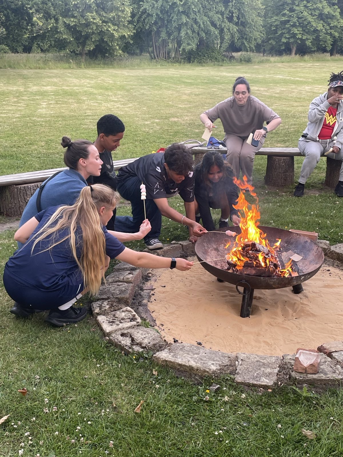 Sue and Willow picked us up and took us to the Westbrook Centre, where we were staying. Our room had three bunk beds—it felt like a little adventure. Dinner that night was amazing, and I got to see my cousins. Jamai and I explored a giant chess board (he lost a lot!), then found a hidden forest park with a zipline—that was my favourite. Later, we roasted marshmallows on the bonfire and played in the games room with ping pong and pool tables. After that, we had a really good sleep.